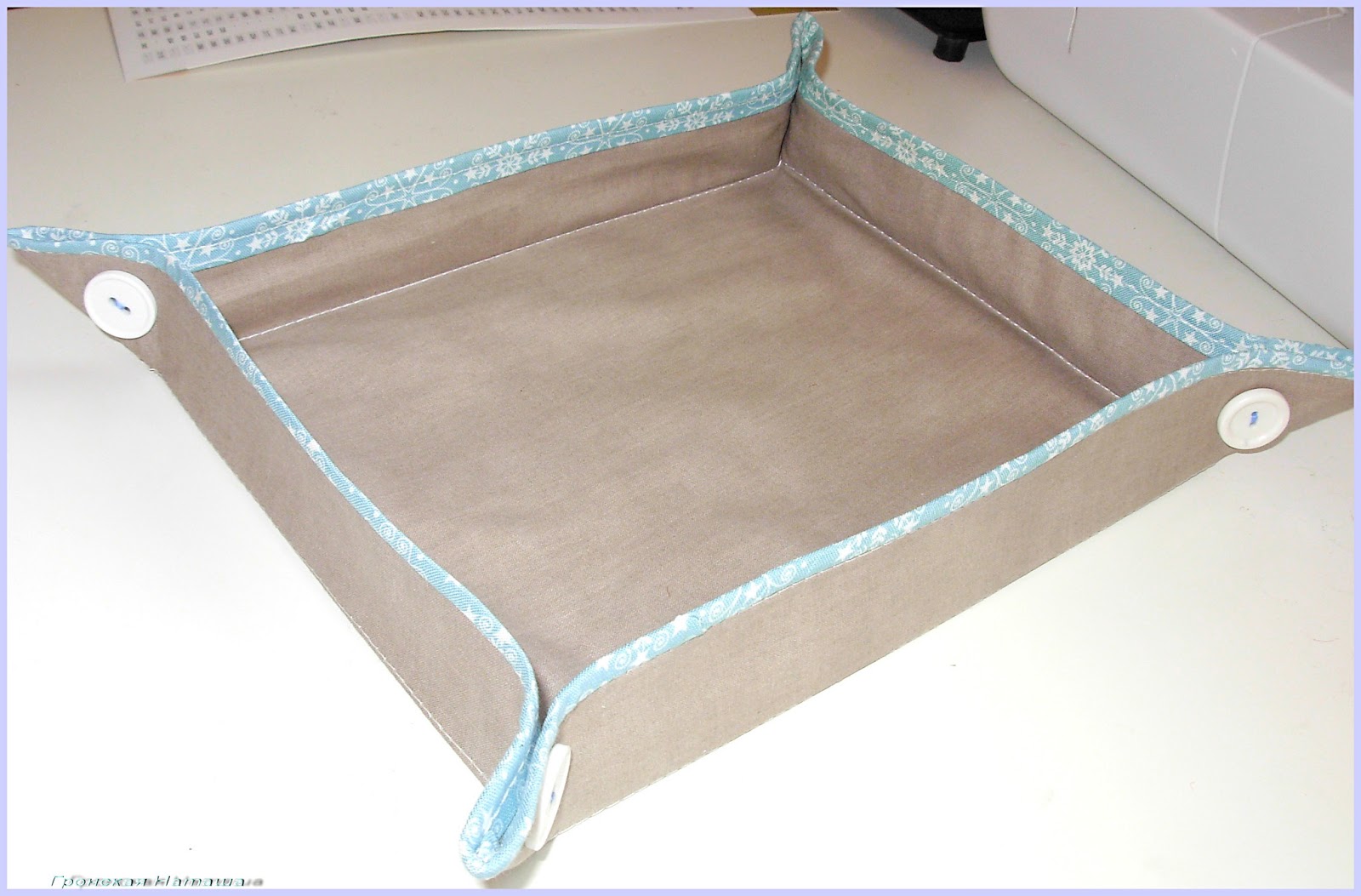Попросил дорогой сшить не глубокую ,но не маленькую коробульку чтоб возле ноутбука щтучки ,ручки и прочее по столу не болталось .Приятно :) Сшилась на одном дыхании :) Украсить правда как в классическом варианте ленточками и завязочками не решилась -не себе же шью:) Приспособила старые бельевые пуговки:) Да и укрепила для надежности флизеленом на основе из бязи .Коробулька уже при деле:)